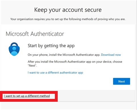 Após clicar neste local destacado em vermelho, traduzindo para o português “Eu quero configurar utilizando um método diferente”, continuará normalmente com o cadastro do telefone e e-mail, sem a necessidade de instalação do Authenticator. E sempre que for logar sempre receberá um SMS ou uma ligação que deverá selecionar previamente ao inserir a senha.