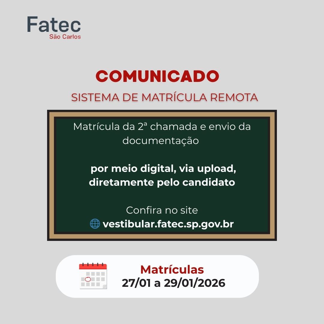 A Fatec São Carlos informa que está aberto o período de matrícula da 2ª chamada do Vestibular para ingresso no 1º semestre letivo de 2026.